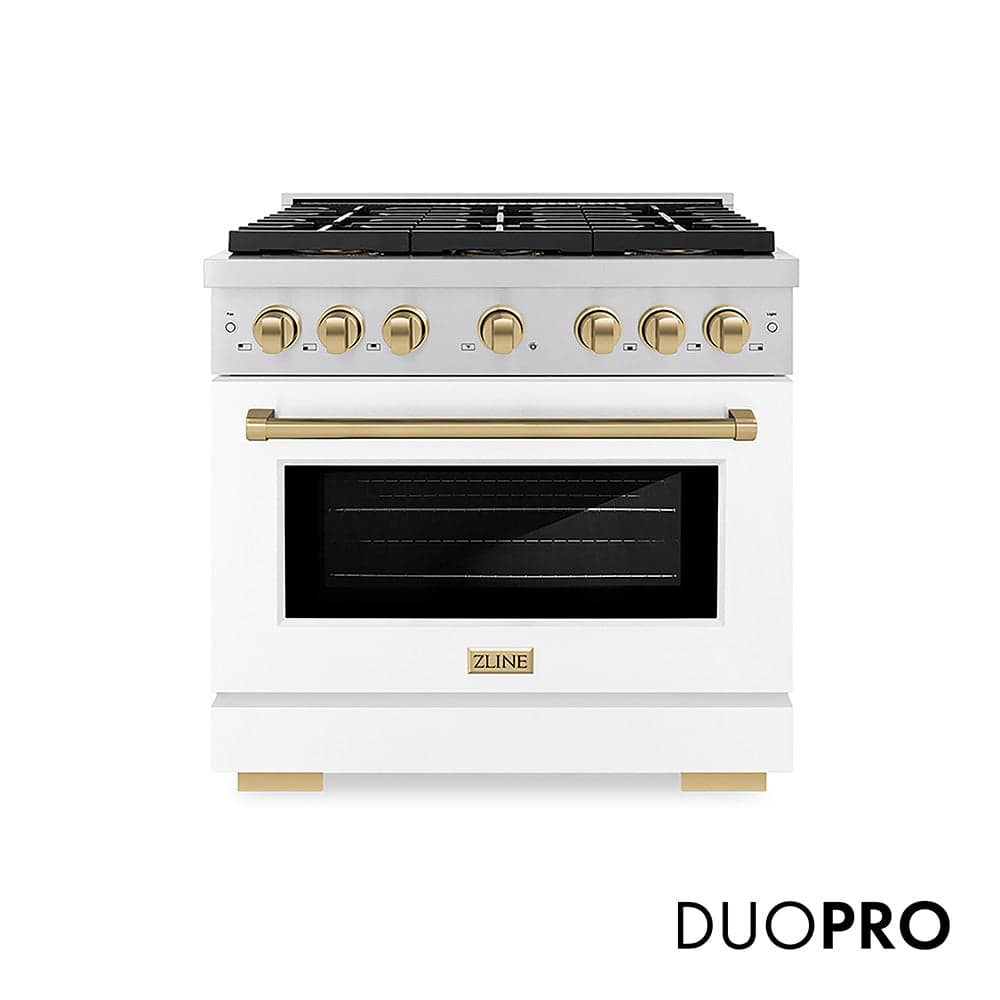 Range Hoods - ZLINE Autograph Edition 36 in. 5.2 cu. ft. Paramount Dual Fuel Range with 6 Burner DuoPro Cooktop and Electric Convection Oven with White Matte Door and Champagne Bronze Accents (PSDRZ-WM-36-CB)