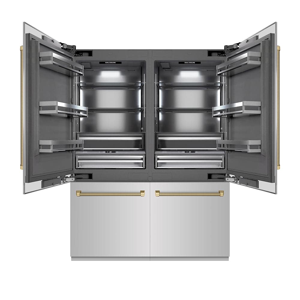 Refrigeration - ZLINE Autograph Edition 60 in. 32.2 cu. ft. French Door Built-In Bottom Freezer Refrigerator with Water Dispenser and Ice Maker in Stainless Steel with Graphite Gray Interior and Champagne Bronze Helix Handles (GRBIVZ-30460KCB)